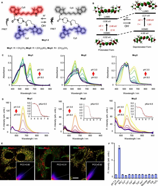 作者基于 Cy3–Cy5 的 FRET 荧光体系设计了三种 pH 响应型线粒体探针 Mcy1–3,通过调控疏水性侧链来优化线粒体靶向能力。探针采用 pH 敏感的非对称 Cy5 作为能量受体,实现稳定的比率型 pH 响应,其响应机制经 TDDFT 计算与光谱实验验证。Mcy1–3 的 pKa 均落在自噬溶酶体相关的 pH 区间,适用于监测线粒体自噬中间体。其中,Mcy3 具有最高的荧光量子产率、最优的线粒体共定位能力、良好的选择性与光稳定性,因此被选为后续线粒体自噬评估与成像分析的核心探针。