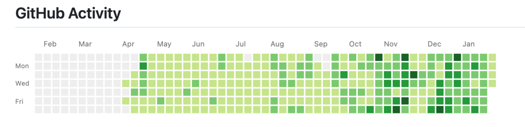 Peter的GitHub热力图,可以看到他从4月开始重新写代码。