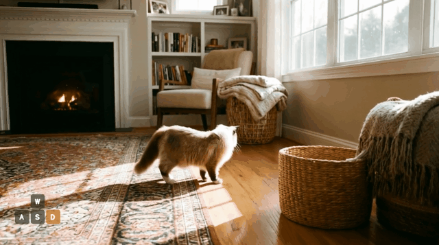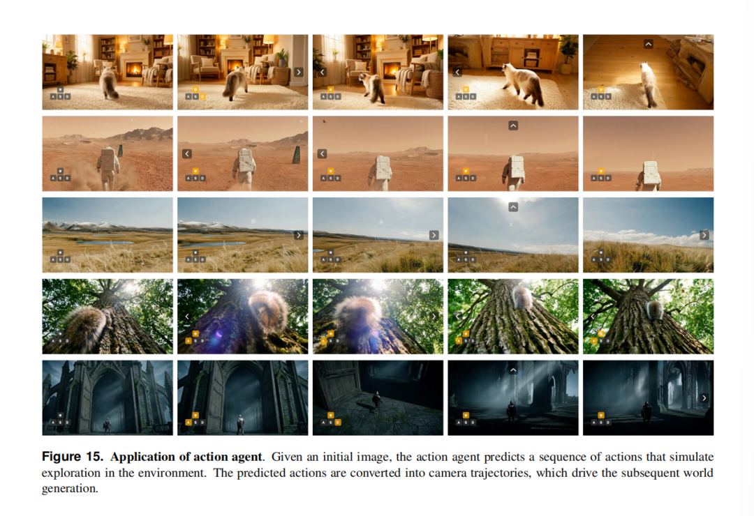 结果显示,模型既能处理「冬季」「像素艺术」这样的全局性环境变化,也能精准调控「烟花」「鱼类」这样的局部情境,并且始终保持物理与时间维度的连贯性。另外,它还可以作为一个行动智能体,预测一系列模拟环境探索的动作,转换为相机轨迹,从而驱动后续的世界生成。