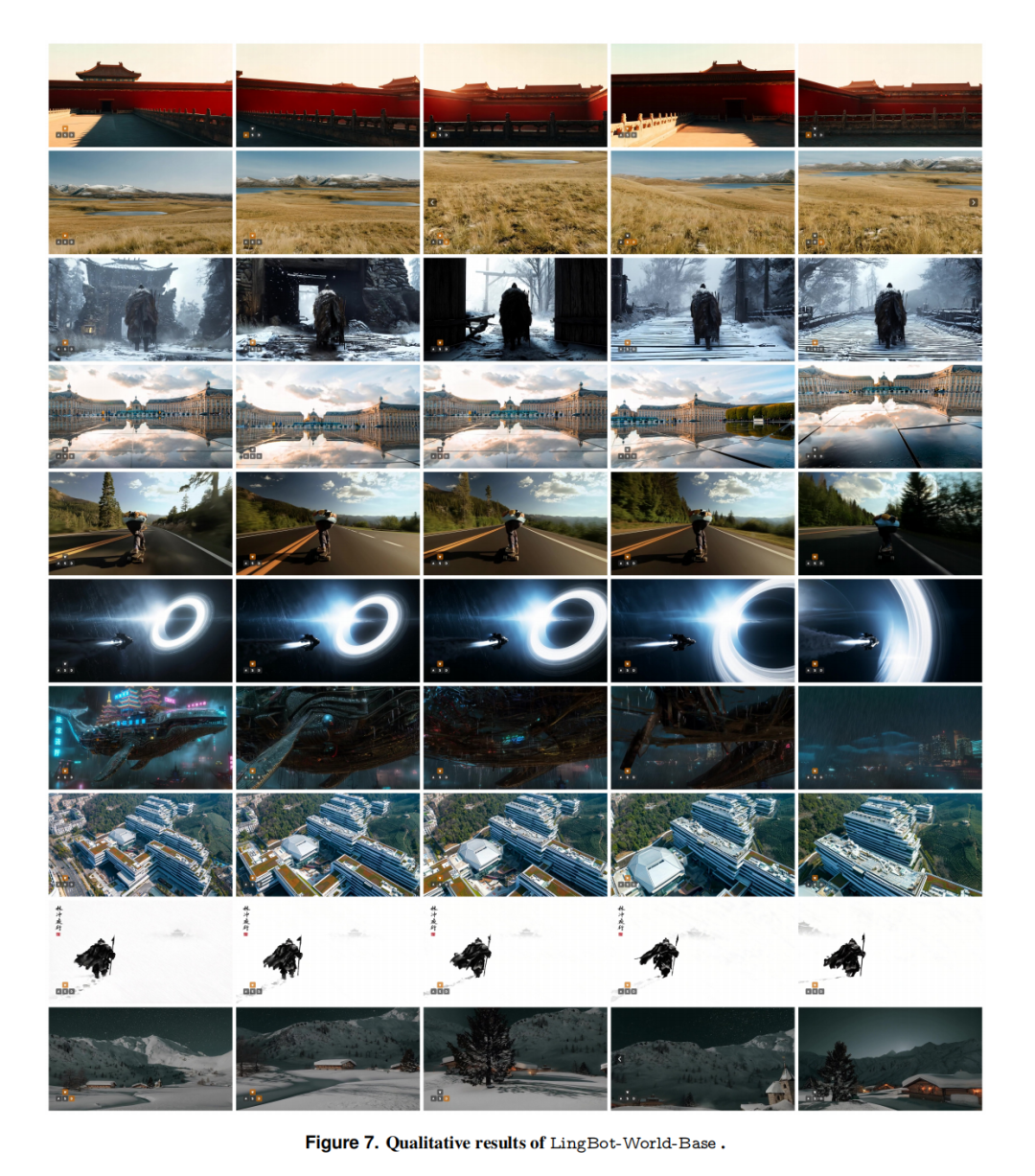 定性分析结果显示,LingBot-World能有效处理不同物体的属性和空间构型,帧与帧之间的过渡极其流畅,并且逻辑自洽。