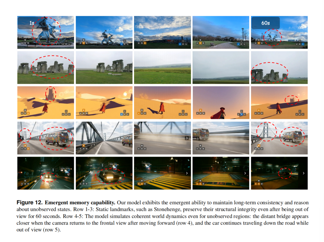 比如下图第5行中,离开画面的车辆在未被观测的情况下仍会继续其运动轨迹,并在物理上合理的位置重新出现。这就表明,该模型模拟的是现实世界中潜在的时空一致性,而非简单地记忆像素数据。