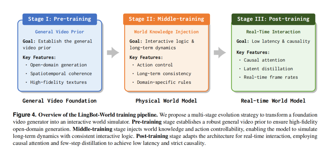 在这个训练流程中,第一阶段(预训练)会建立一个通用视频先验。第二阶段(中期训练)会注入世界知识;第三阶段(后训练)则是实现低延迟与严格因果关系。