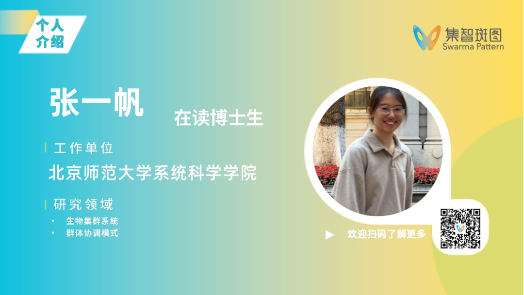 主讲人:张一帆,北京师范大学系统科学学院在读博士生。主要从事生物集群系统的涌现特征与动力学机理研究。研究重点包括蚁群在刺激环境下的自组织状态切换、个体间信息传递的相关性,以及微观行为如何驱动群体层面的协调模式。