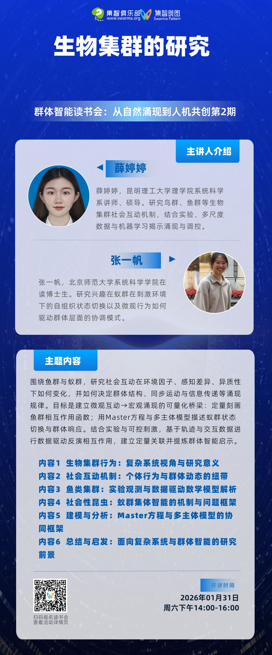 集智俱乐部联合北京师范大学系统科学学院韩战钢教授、暨南大学计算传播研究中心赵甜芳副教授、新疆大学物理科学与技术学院玉素甫·艾比布拉副教授等学者,共同发起本次「群体智能」读书会,尝试用一条普适的线索,把自然界的鸟群蚁群、人类社会的集群行为、以及人工智能时代的多智能体与群智优化,放在同一张地图上重新理解。读书会自2026年1月24日开始,安排在每周六下午 14:00–16:00,欢迎所有对群体智能如何涌现、如何被理解、以及如何被设计,感兴趣的朋友一起加入:带着问题来,带着更有趣的问题去。