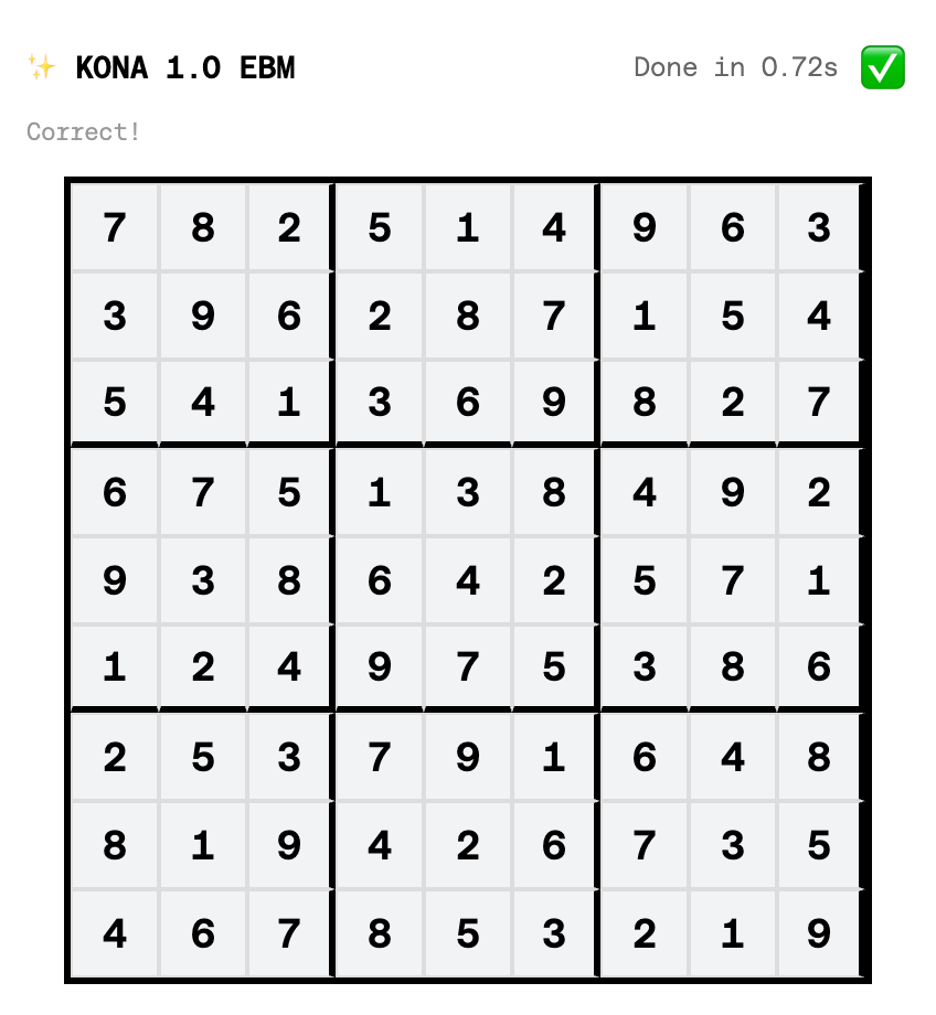 在数独游戏测试上,Logical Intelligence推出的模型Kona不到1s就正确完成了数字填写,