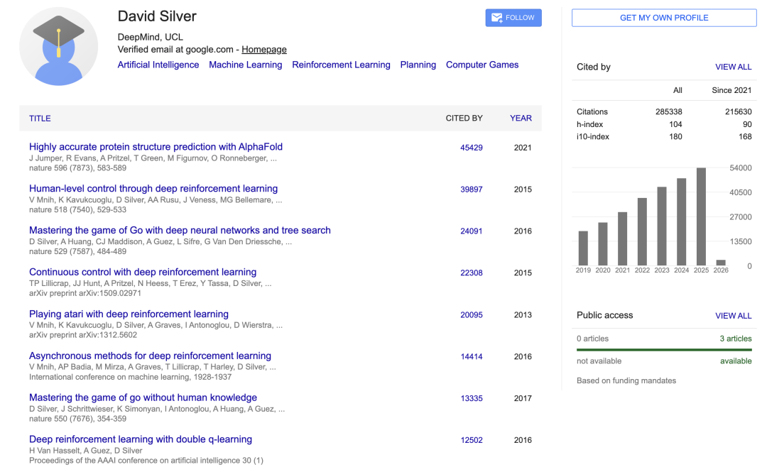 Silver是DeepMind员工中发表论文最多的人之一,谷歌学术统计其论文被引用超过28万次,h-index高达104。