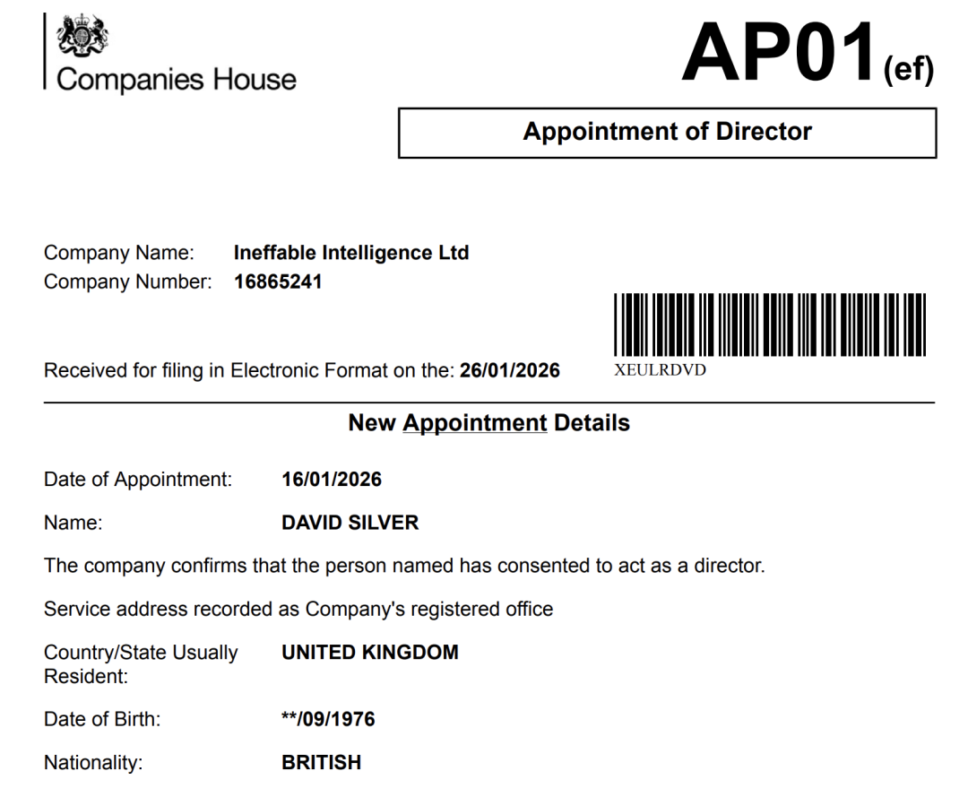 根据注册文件显示,这家公司早在2025年11月就已悄然成立,Silver本人于2026年1月16日被正式任命为公司董事。