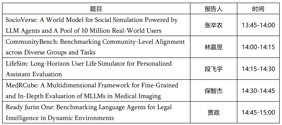 下午举行的分论坛二以“大模型社会智能”为主题,由梁敬聪博士生主持。相关报告围绕社会模拟、价值对齐、个体建模以及医疗、法律等应用场景,探讨了大模型在复杂社会情境中的建模方法与评估问题。