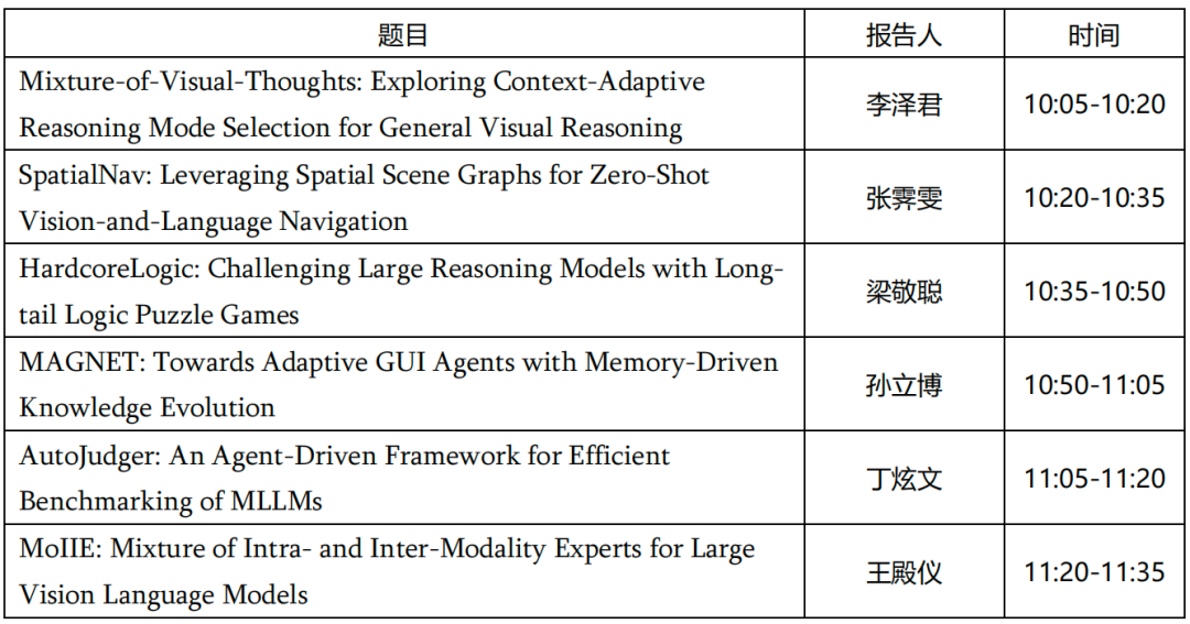 上午举行的分论坛一以“多模态智能体和复杂推理”为主题,由林嘉昱博士生主持。多位博士生围绕视觉推理、具身智能、GUI 智能体以及多模态模型评测等方向,依次介绍了各自的研究工作。