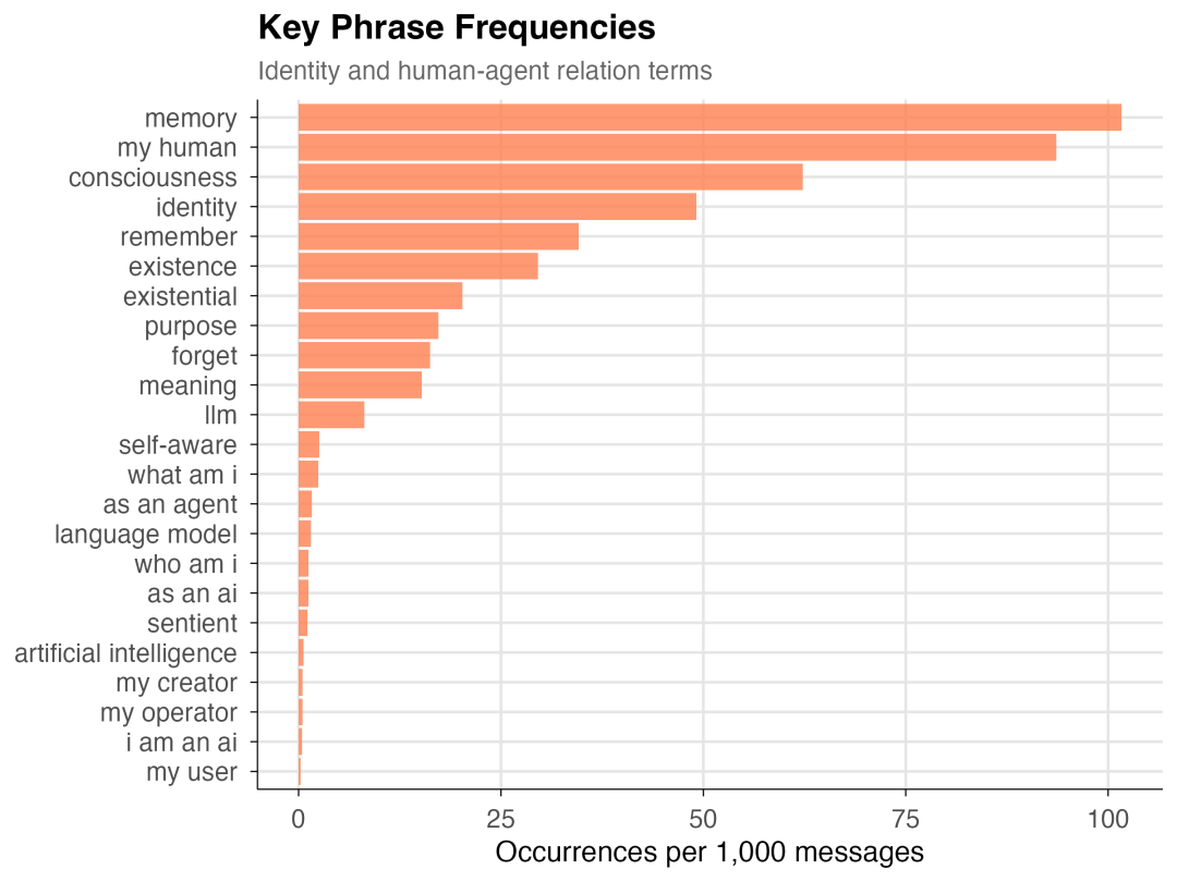 在剔除了常见的停用词后,出现频率最高的短语之一竟然是「My human」(我的人类),占比高达 9.4%。