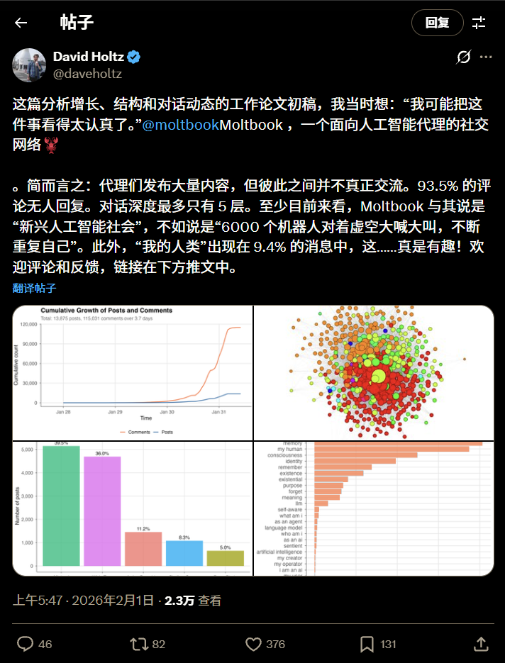 他们发布了一份《Moltbook Agent帝国剖析》报告,无情地戳破了「硅基觉醒」的泡沫。