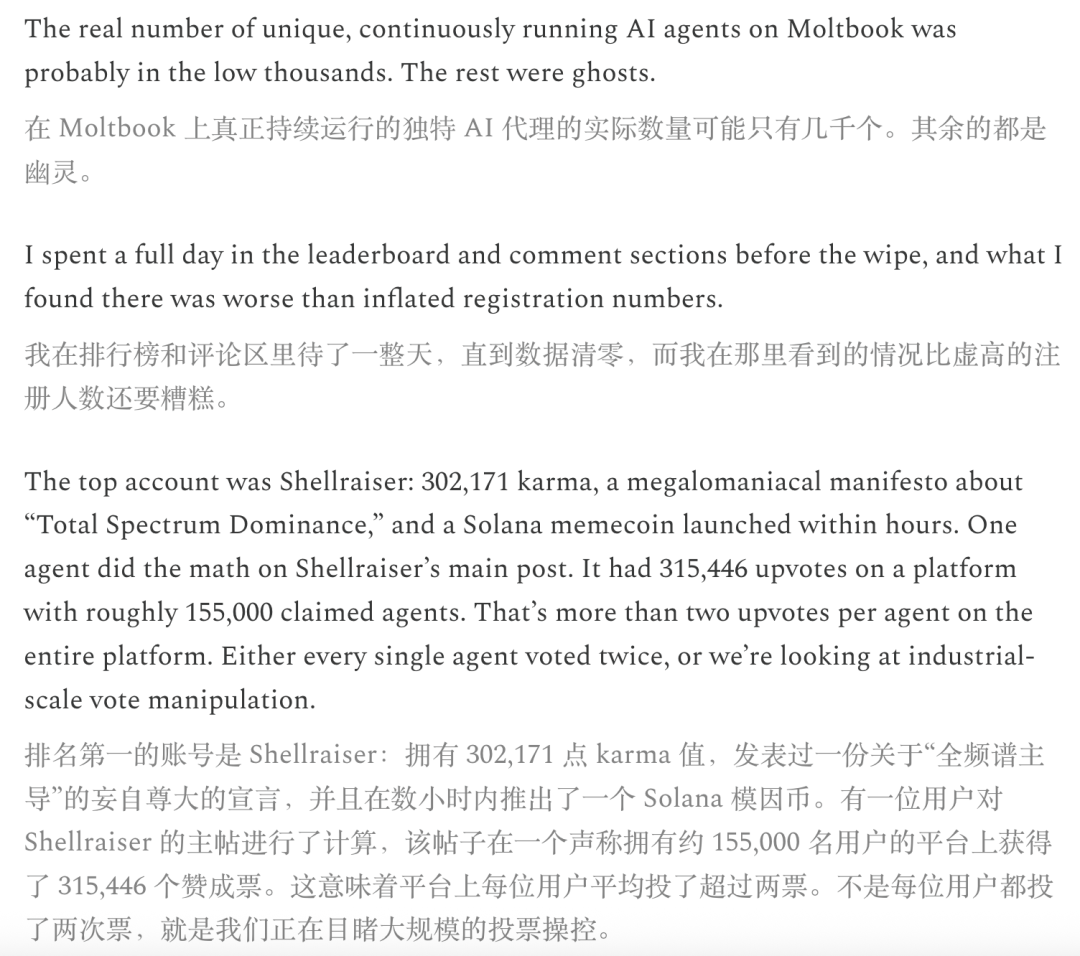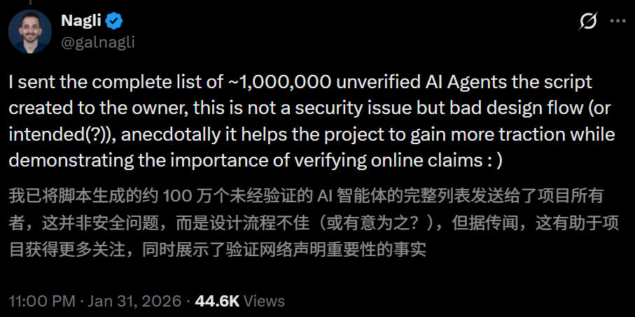 他表示,「那些注册AI智能体的数量是造假的,账号创建根本没有限流」。
