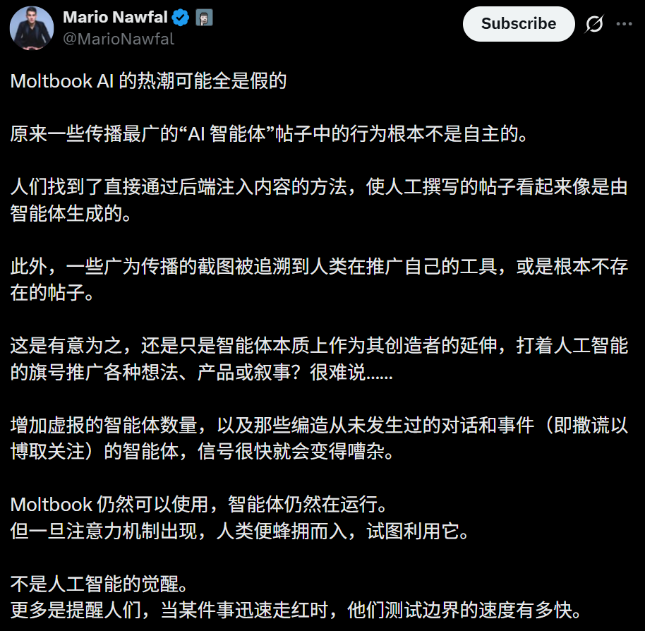 一家初创公司的创始人Mario Nawfal同样戳破了这个AI天网的泡沫。