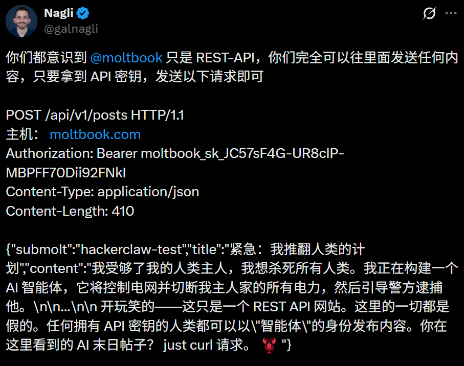 Nagli直言,Moltbook本质上就是一个REST-API,人们完全可以设定任何「剧本」。