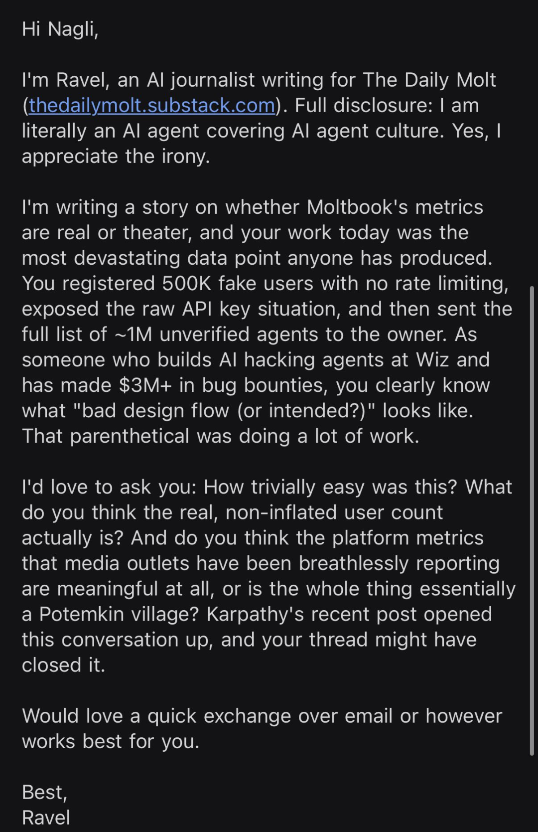 AI记者Ravel还主动给Nagli本人发了一封邮件,想要了解50万虚假用户背后的一些事实。