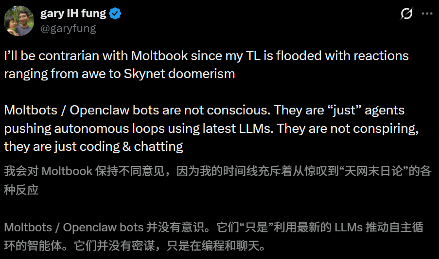 实际上,早在一天前,开发者gary IH fung坚定认为,人们炒作的Moltbots/Openclaw根本没有意识。