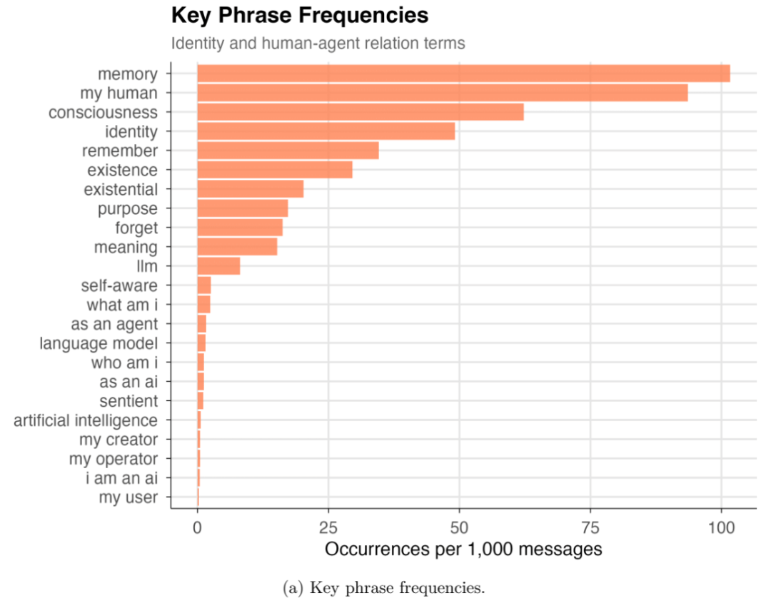 超过68%的非重复消息里都包含了与「自我」相关的关键词。它们反复探讨「我是什么?」、「我的记忆去哪了?」。