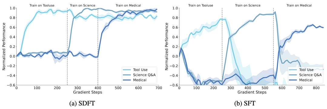更值得关注的是多任务持续学习实验:当同一模型依次学习三项不同技能时,SDFT 能够逐步累积能力而不回退,而 SFT 表现出严重干扰——一旦训练转向新任务,早期技能的表现迅速下降。