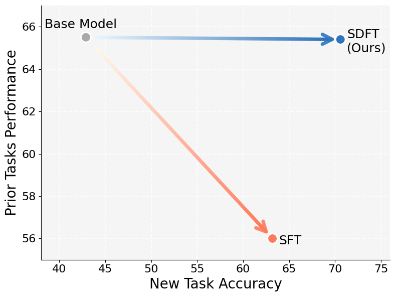 图 | SFT 通常用于从专家演示数据集中学习,但其离策略特性会导致通用能力的灾难性遗忘。研究团队提出 SDFT,通过使用模型的演示条件版本作为自身教师,将专家演示转化为策略内学习信号。SDFT 通过这种方式实现了真正的持续学习,使模型在新任务出现时不断改进,同时不会退化现有能力。