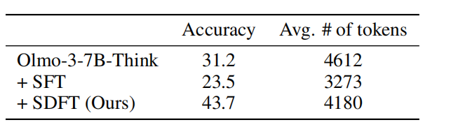 表格 | 使用仅含答案的监督训练推理模型。 SFT 会降低任务表现和整体推理能力(表现为回答时间缩短)。 SDFT 通过从示范条件下的教师学习而非直接从示范中学习,避免了这种性能下降。