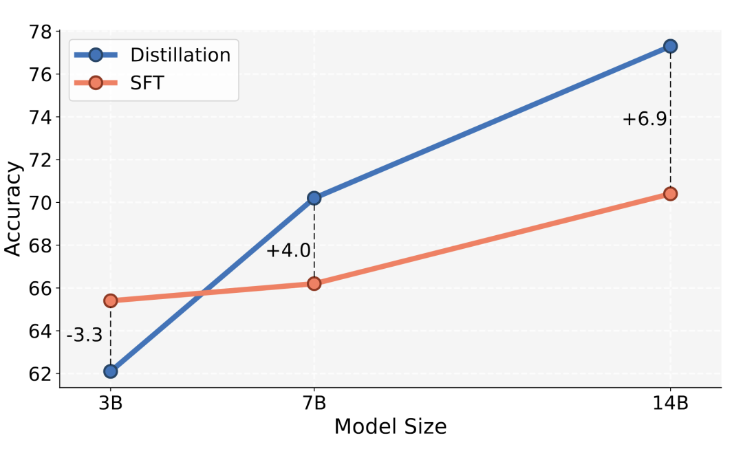 图 | SDFT 受益于模型规模。在科学问答任务中,SDFT 与 SFT 之间的性能差距随着模型规模的增大而扩大,因为更大模型具有更强的上下文学习能力。