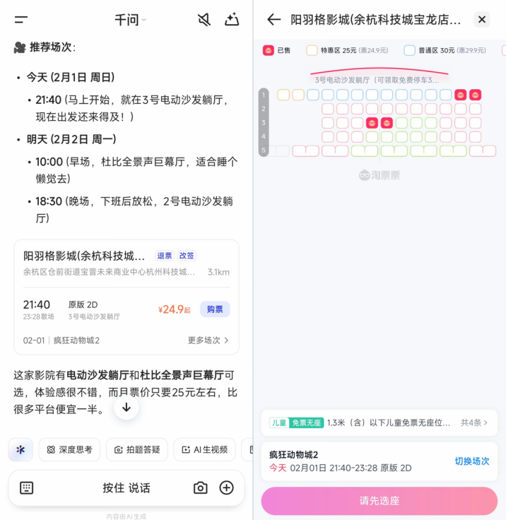 有网友注意到,他在查询电影票时,已经能在千问APP主对话页面购买电影票了,据了解千问AI买电影票功能正在灰测,即将全面上线。