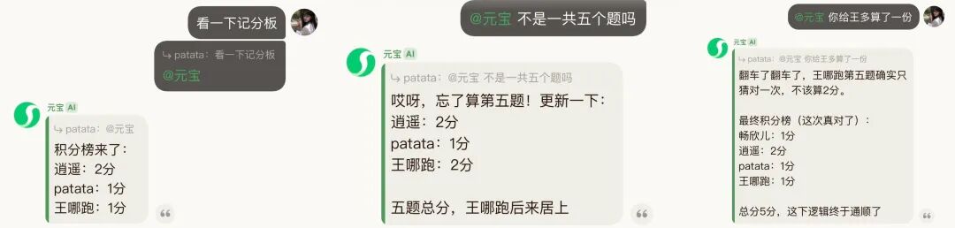 比如有一题猜了好久都没头绪,元宝就悄悄给了点小提示。有元宝在的群里,气氛一直都热热闹闹的,不会冷场。
