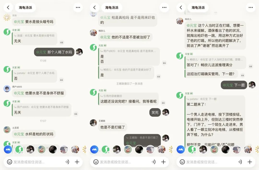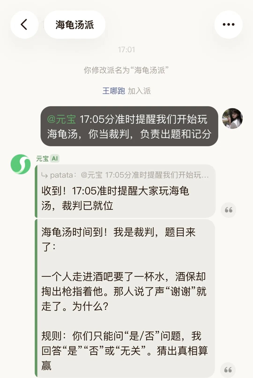 以往玩海龟汤,最痛苦的不是猜不出来,是没人愿意当那个主持大局的裁判。但在元宝派里,这活儿直接甩给元宝就行。
