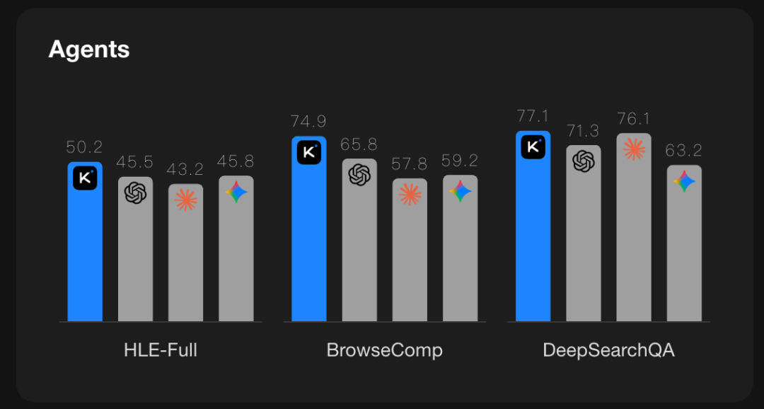 Kimi K2.5主打Agent能力,在HLE-Full、BrowseComp等测试集中,成绩超越了GPT-5.2、Claude 4.5 Opus以及Gemini 3 Pro等旗舰闭源模型。