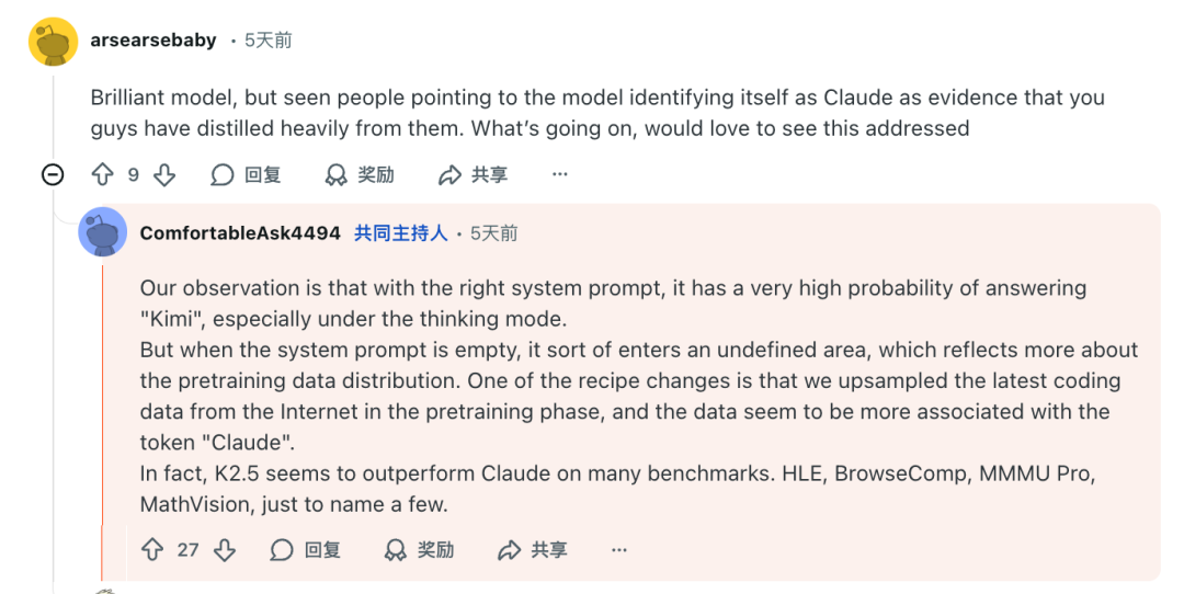 针对K2.5偶尔会自称Claude的趣闻,团队也给出了坦诚的解释——