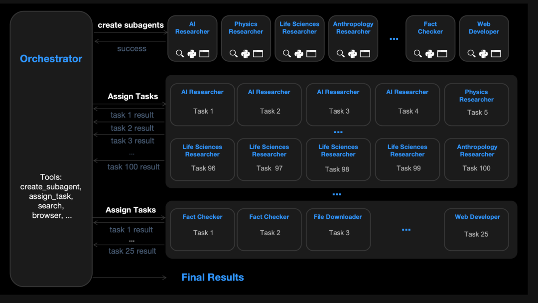 这是一套能自主构建百人规模数字化团队的并行系统,让模型获得了“分身”能力,可以瞬间创建并编排多达100个子智能体,并支持调用1500个工具的并行工作流。