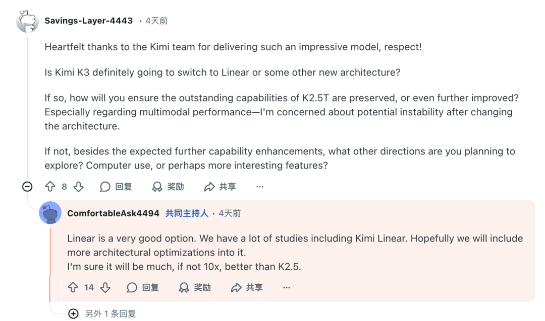 对于大家最关心的下一代Kimi K3,团队给出了一个相当硬核的预告——它很可能基于线性注意力机制。