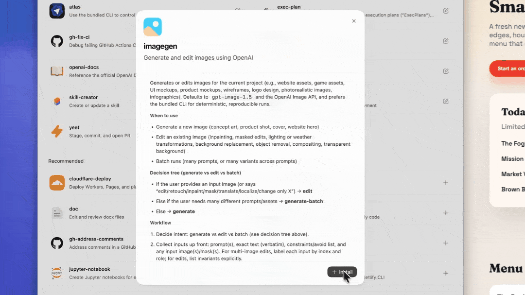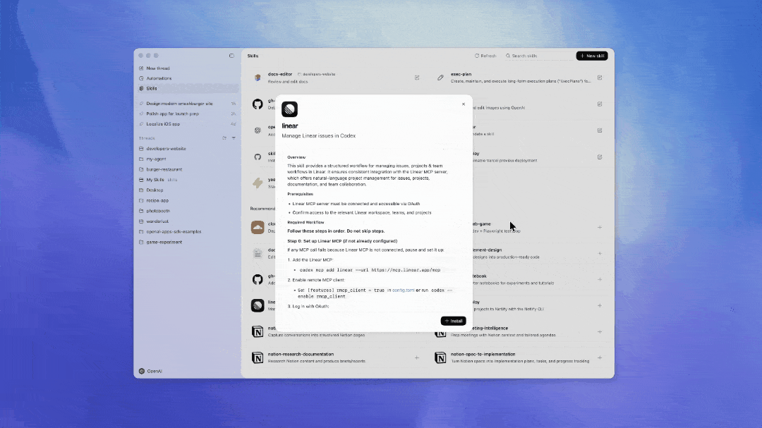 Codex应用内置了一个Skills库,涵盖了OpenAI内部流行的工具和工作流,下面重点介绍几个。
