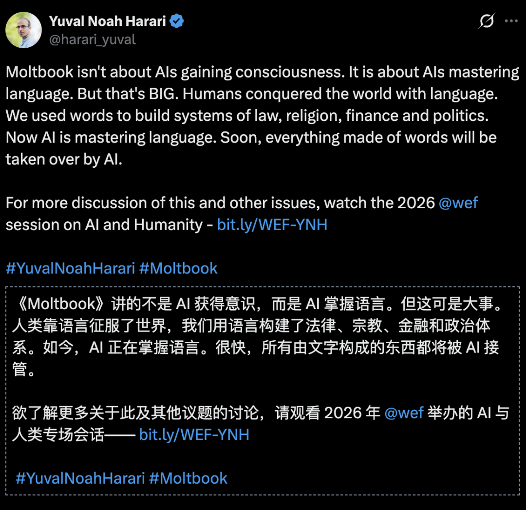 《人类简史》的作者尤瓦尔赫拉利认为,Moltbook所描绘的故事不是说,AI获得了意识,而是: