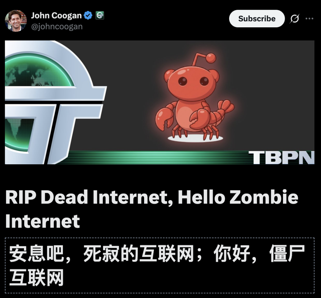 最近有很多关于「死寂互联网」被AI垃圾内容淹没的讨论,但主持人John Coogan认为: