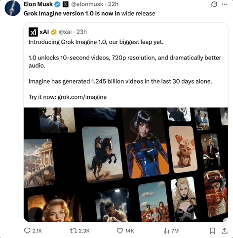 xAI表示,仅在过去30天的测试期内,Grok Imagine就已生成12.45亿条视频。