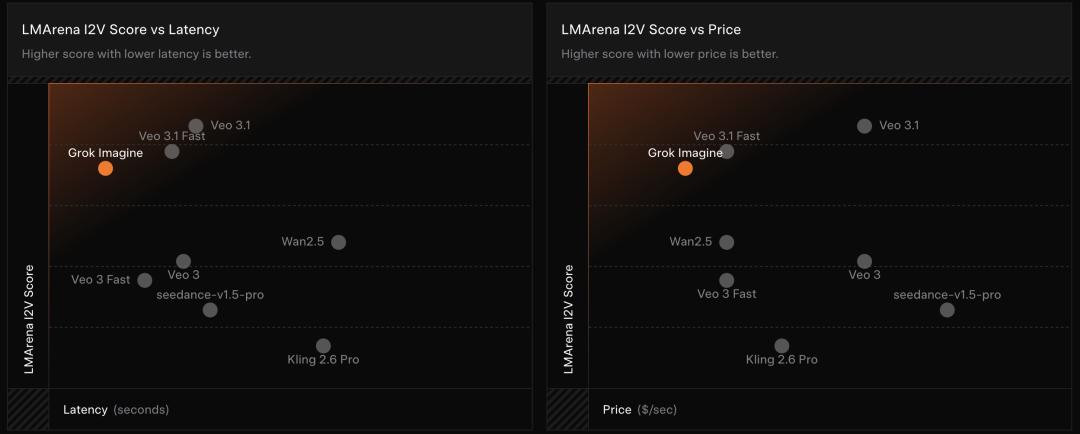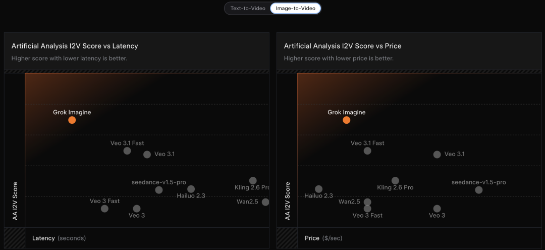 图生成视频方面,Grok Imagine同样保持了高评分+低延迟+低成本的综合优势: