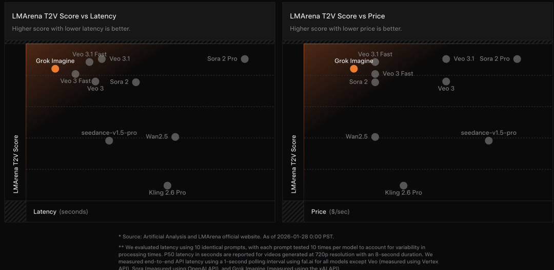 Artificial Analysis和LMArena两家机构评估结果对比如下,均显示Grok Imagine在延迟和成本上处于领先位置: