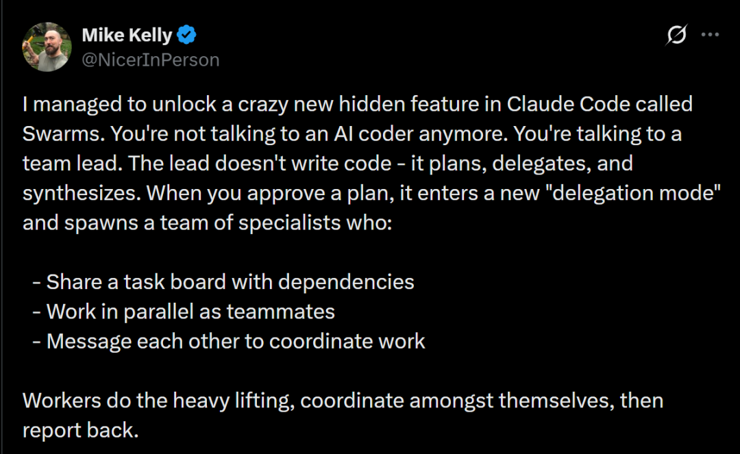 爆料的关键人叫Mike Kelly,他在X上爆了个猛料:Claude Code里,藏着一个尚未公开的 Swarm功能。