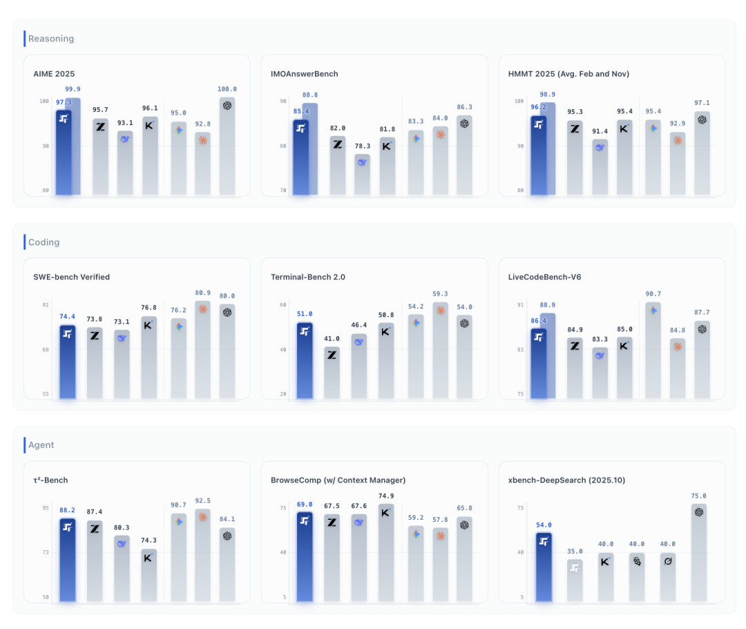 新模型在推理类测试排名均在前列,其中AIME 2025基准测试中得分97.3;