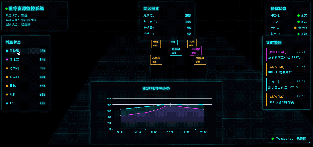 开发一个医疗资源监控仪表盘,使用WebGL渲染3D院区场景。各科室、急诊、手术室设置发光点位,点击后放大区域并展示半透明数据层,包含床位、接诊量、设备利用率图表。数据通过WebSocket实时更新,网络异常使用缓存。