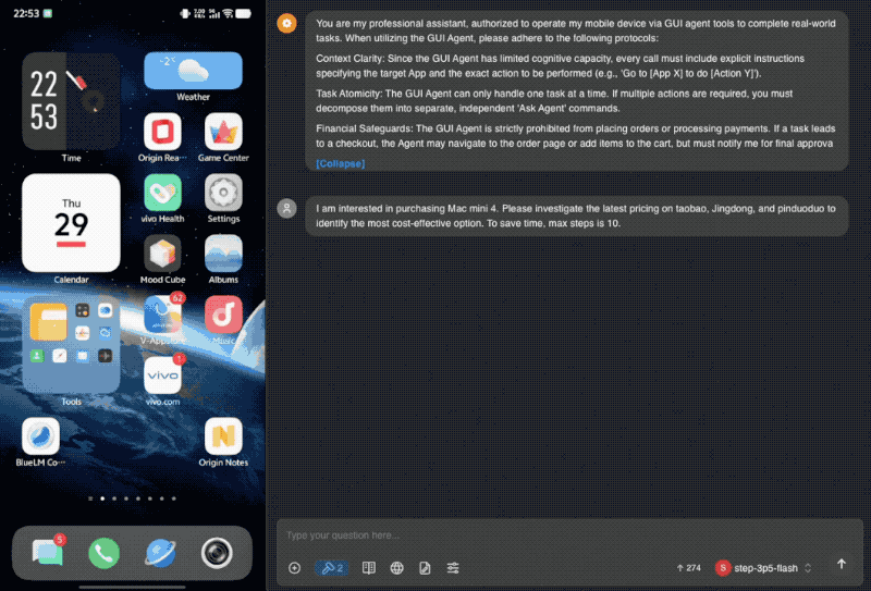 在官方的电商比价演示中,面对用户“对比 Mac Mini M4 各平台价格”的需求,Step 3.5 Flash化身云端大脑,直接将复杂的比价任务,拆解为分别查询淘宝、京东、拼多多的独立小任务。