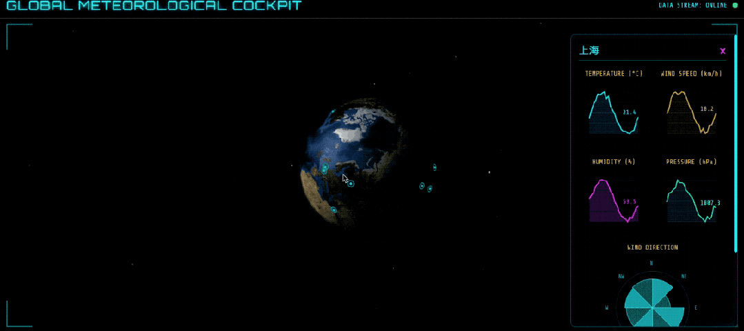 制作一个艺术化气象仪表盘,使用WebGL渲染3D真实地球。各国主要城市显示发光标记点,点击后镜头平滑放大到对应区域,并切换为半透明2D叠加层,展示该地区的详细气象图表。数据通过WebSocket实时流式传输,网络异常时自动降级使用缓存快照,保证界面稳定运行。