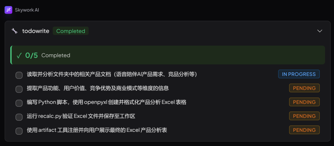 而Skywork桌面版在一通分析后,很快就按以下五个步骤完成了表格生成:
