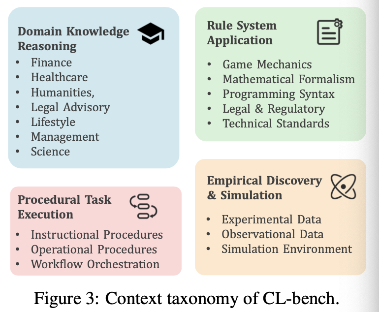 这个基准包含由资深领域专家精心制作的500个复杂上下文、1899个任务和31607个验证标准。设计原则只有一条:解决每个任务要求模型必须从上下文中学习到预训练中不存在的新知识,并正确应用。