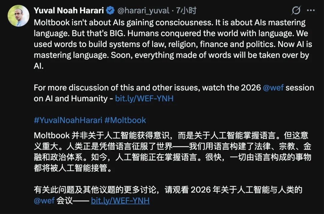 就在大家还在为Moltbook上那10万个AI自建「电子宗教」吃瓜看戏时,赫拉利站出来狠狠泼了一盆冷水: