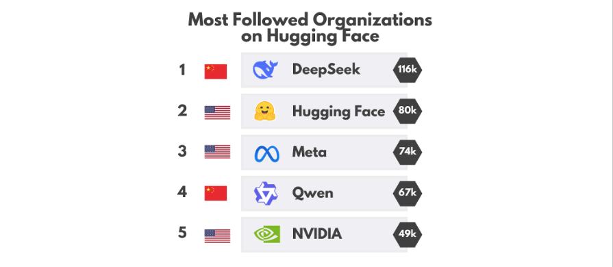 这种协作正在超越国家边界;在 Hugging Face 上,关注度最高的组织是 DeepSeek,而关注度排名第四的则是 Qwen。