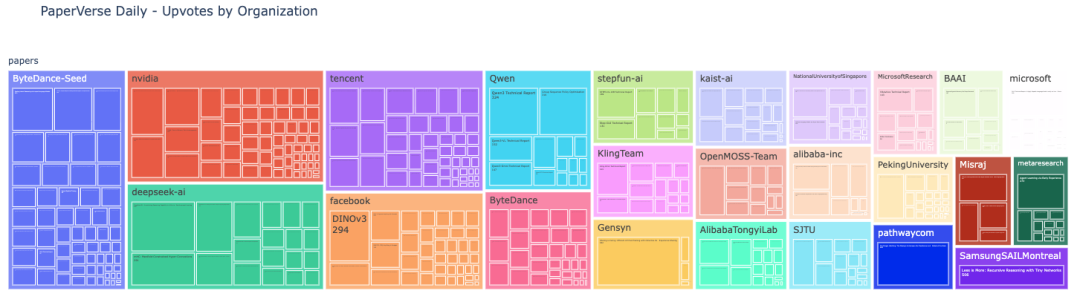 除了模型之外,公开共享的科学成果和技术方法不仅为其他组织提供了参考,也惠及了整个开源社区。 Hugging Face 上最受欢迎的论文大多来自中国组织,主要包括字节跳动、DeepSeek、腾讯和 Qwen。
