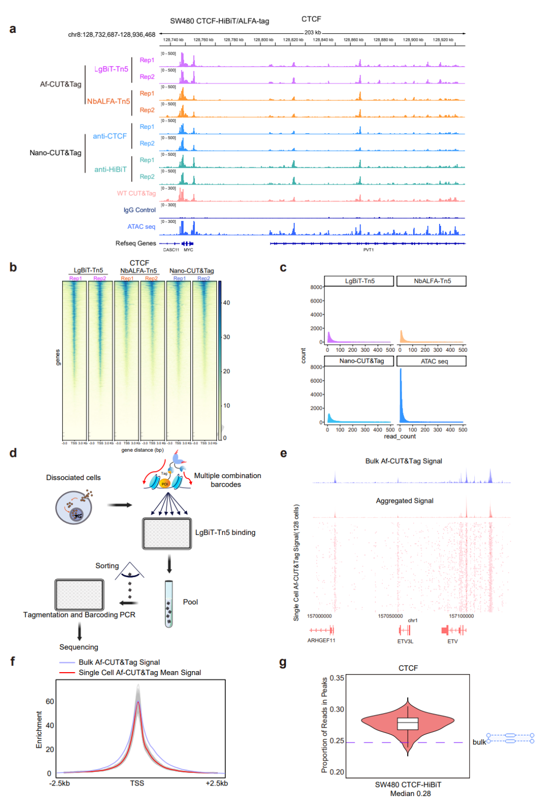 Af-CUT&Tag可实现RNA聚合酶Ⅱ的高分辨率图谱绘制。细胞经通透处理后,引入与接头结合好的融合蛋白LgBiT-Tn5或NbALFA-Tn5,LgBiT-Tn5或NbALFA-Tn5会特异性地与目标蛋白的C端的HiBiT或ALFA标签结合,形成稳定的蛋白质复合物,处理后生成高质量文库(图1h)。在SW480 WT细胞中,经LgBiT-Tn5蛋白酶切割后并未出现明显的峰值,证实了该方法的特异性(图2a)。