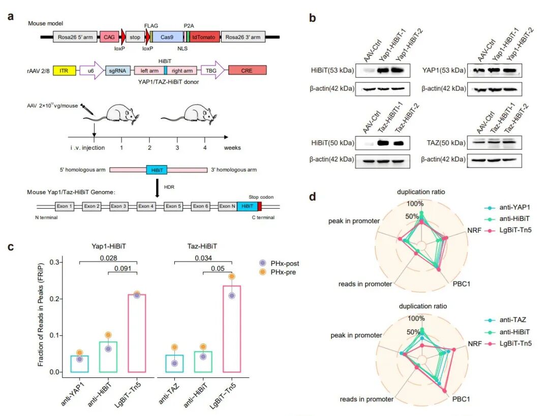 Af-CUT&Tag通过与基于CRISPR的标签敲入技术相结合,能够高效地在体外和体内对POI结合的染色质图谱进行分析。在肝脏再生机制探究中,对Af-CUT&Tag和Nano-CUT&Tag数据集的分析显示(图4),Af-CUT&Tag图谱在TSS区域的信号积累显著增强。使用Af-CUT&Tag进行Yap1和Taz图谱分析时,显示出高度可重复性。通过比较各区域reads及文库质量指标,进一步证实了Af-CUT&Tag在复杂肝细胞组织中的卓越性能(图4c、d)。Af-CUT&Tag还可用于再生肝脏组织的单细胞分析,为每个细胞核生成独特的reads,超高灵敏度使其成为组织单细胞转录调控分析的理想选择。